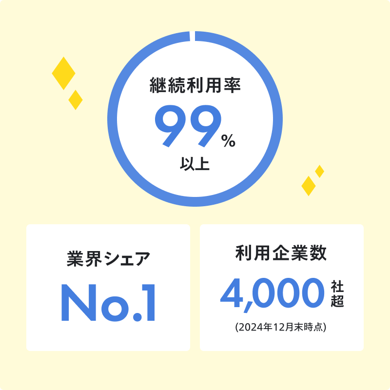 「カオナビ」は4,000社以上(※1)に導入され、タレントマネジメントシステム市場で8年連続シェアNo.1(※2)を獲得。継続利用率は99%以上(※3)を維持しており、機能の使いやすさと顧客満足度の高さを強みとしています。