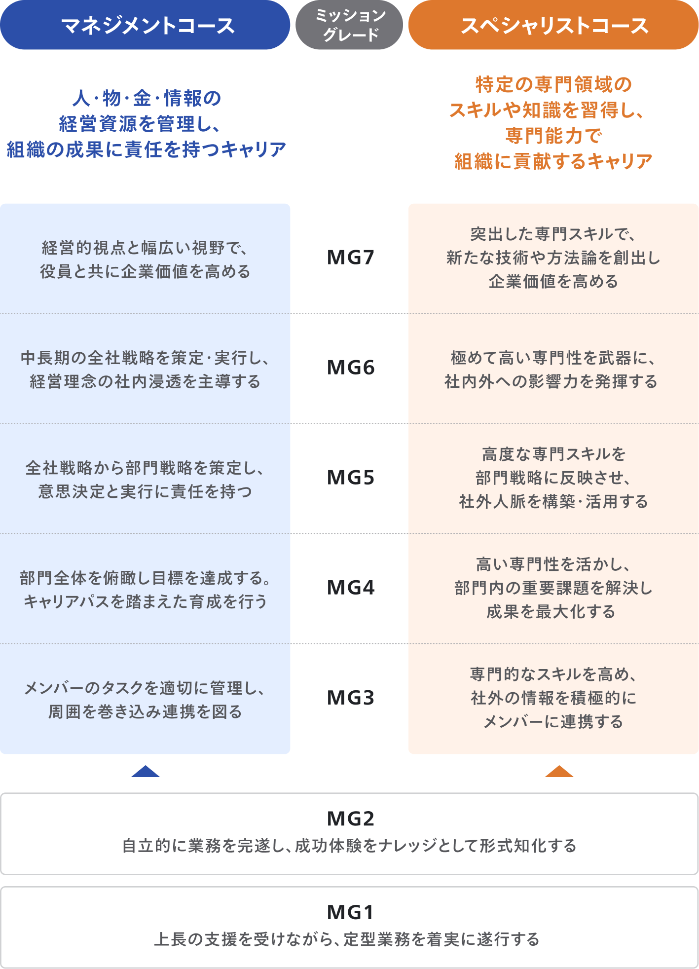 マネジメントコースとスペシャリストコースの2つのキャリアパスを示した図。【2つのコース共通のミッション】ミッショングレード1:上長の支援を受けながら、定型業務を着実に遂行する。 ミッショングレード2:自律的に業務を完遂し、成功体験をナレッジとして形式知化する。【マネジメントコース:人・物・金・情報の経営資源を管理し、組織の成果に責任を持つキャリア】 ミッショングレード3:メンバーのタスクを適切に管理し、周囲を巻き込み連携を図る。 ミッショングレード4:部門全体を俯瞰し目標を達成する。キャリアパスを踏まえた育成を行う。 ミッショングレード5:全社戦略から部門戦略を策定し、意思決定と実行に責任を持つ。 ミッショングレード6:中長期の全社戦略を策定・実行し、経営理念の社内浸透を主導する。 ミッショングレード7:経営的視点と幅広い視野で、役員と共に企業価値を高める。【スペシャリストコース:特定の専門領域のスキルや知識を習得し、専門能力で組織に貢献するキャリア】 ミッショングレード3:専門的なスキルを高め、社外の情報を積極的にメンバーに連携する。 ミッショングレード4:高い専門性を活かし、部門内の重要課題を解決し成果を最大化する。 ミッショングレード5:高度な専門スキルを部門戦略に反映させ、社外人脈を構築・活用する。 ミッショングレード6:極めて高い専門性を武器に、社内外への影響力を発揮する。 ミッショングレード7:突出した専門スキルで、新たな技術や方法論を創出し企業価値を高める。